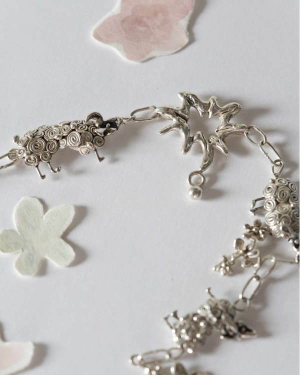 Ce collier représente une prairie : un paysage de fleurs et de moutons, avec soleil, nuages et herbe pour nourrir les animaux. Cette création est née d'un amour pour les moutons et leur nature duveteuse et tendre.