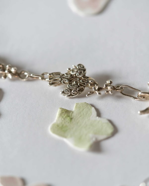 This necklace represents a prairie: a landscape of flowers and a flying bird, with sun, clouds, and grass for the animals to feed on. What's interesting about the composition of the Padera necklace is that aesthetically, it was intended to look rough and punk—somewhat spiky—which is challenging to achieve when working with such adorable elements as birds and flowers. Every single link is unrepeatable and will never exist again. I feel this is what brings them to life. Limited production, entirely handcrafted.