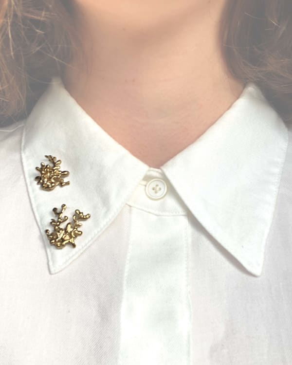 These unique pieces are an elegant and fun proposal to wear on shirts without damaging them. In the form of crabs, these pieces are held to clothing with strong embedded magnets. Made in yellow bronze, they shine and illuminate the face in a unique way.