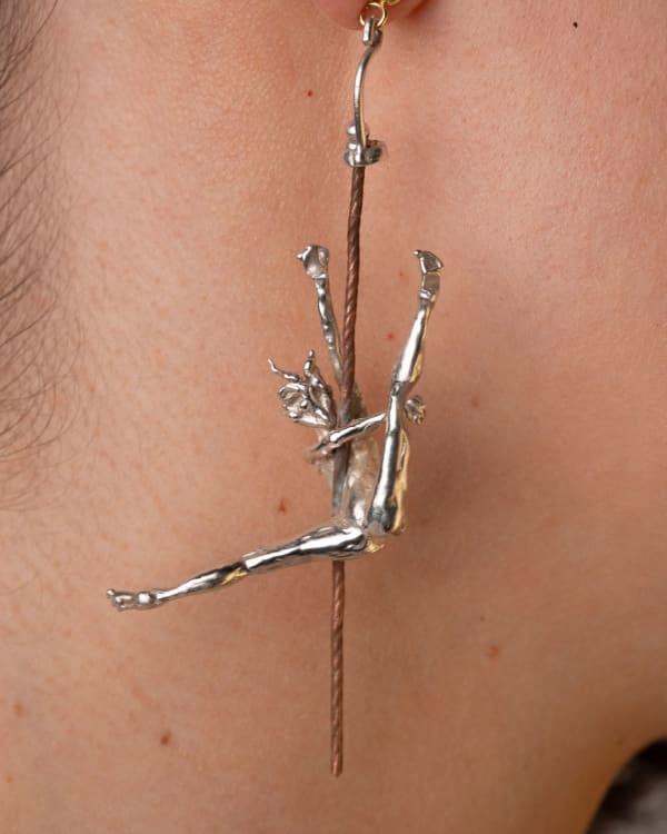 Unique pieces dedicated to celebration and movement. Dancers with masks - this is a collection where each earring is different and plays with the infinity of figures that dance offers us. These earrings spin like dancers and shine like the jewels they are: unique and expressive for all lovers of creativity. This specific dancer wears a ready satyr mask and is a representation of joy.