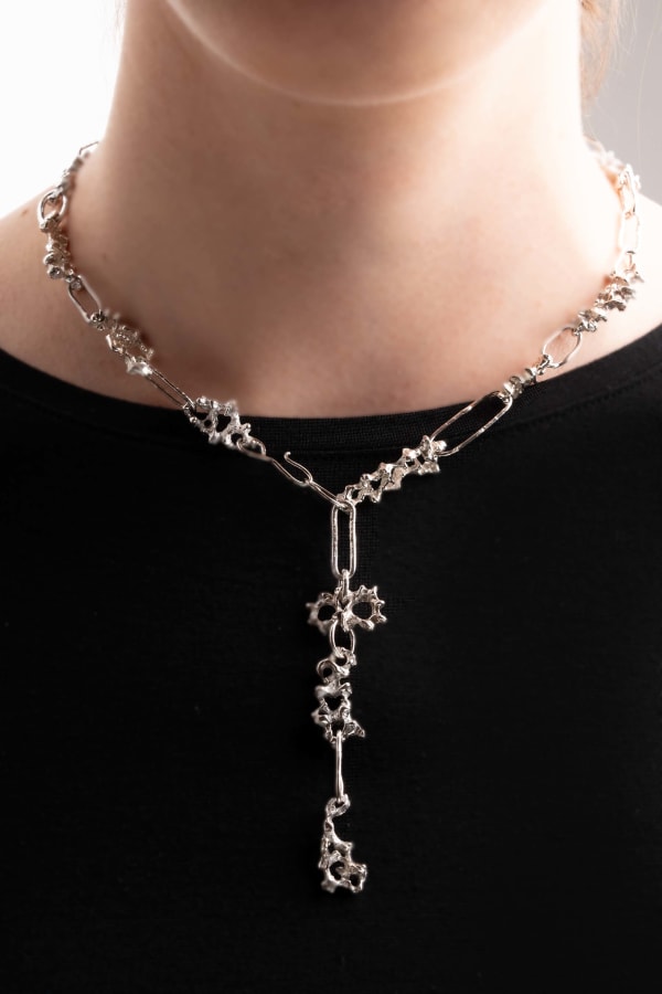 This chain is unique and unrepeatable, each link made by hand and singular. This necklace is a jewel inspired by the sharp edges that smoke can have in its less concentrated forms. Each link was created separately to finally achieve a compositional work where a balance between rough and elegant jewelry was achieved. This piece has an aesthetic inspired by punk, but thanks to its adaptability of use, it can express different styles. The chain mechanism is simple and adjustable, so both its measure and shape can be personalized.