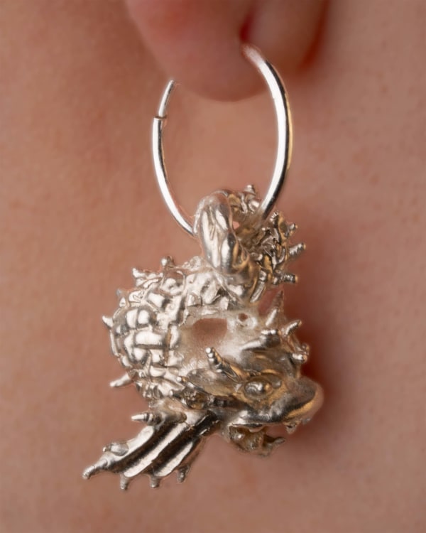 These earrings are inspired by aquatic creatures carved in some Renaissance fountains around Rome. These creatures were the interpretation of dolphins made by artists who hadn't yet seen them. The Brave Fish jewel is a celebration of this history and seeks the most striking way to favor the wearer. This variant is the wildest, representing the most aggressive and imposing form of the creatures, which in turn is the most complex and decorated.