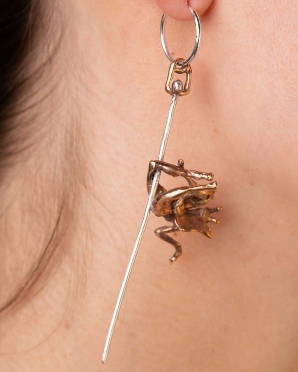 This dancer wears an insect mask with playful antennae that decorate her dance while launching forward in a position called Suicide! Unique pieces dedicated to celebration and movement. Dancers with masks - this is a collection where each earring is different and plays with the infinity of figures that dance offers us. These earrings spin like dancers and shine like the jewels they are: unique and expressive for all lovers of creativity.